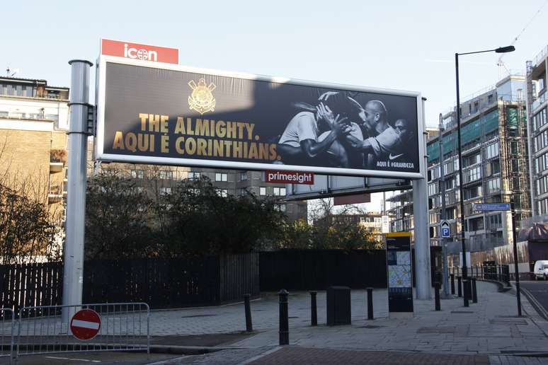 A fornecedora de material esportivo do Corinthians instalou nesta sexta-feira um outdoor em Kensington, área nobre do oeste de Londres, com a foto de jogadores se abraçando na comemoração de um gol e a frase em português "Aqui é Corinthians". A propaganda, que também tem os dizeres The Almighty (O Todo-Poderoso, em tradução livre) foi instalada em frente a um tradicional centro de convenções da cidade.