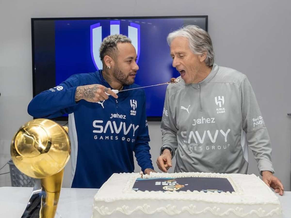 Jorge Jesus foi recebido com festa no Al-Hilal depois de conquistar Globe Soccer Awards de melhor treinador do Oriente Médio. Ele recebeu aplausos dos jogadores no vestiário e exibiu o troféu, posando para fotos com ele. Além disso, ele ganhou um bolo. Neymar foi um dos protagonistas deste momento. O brasileiro cortou o bolo e deu o primeiro pedaço na boca do técnico, o que gerou risadas do elenco.