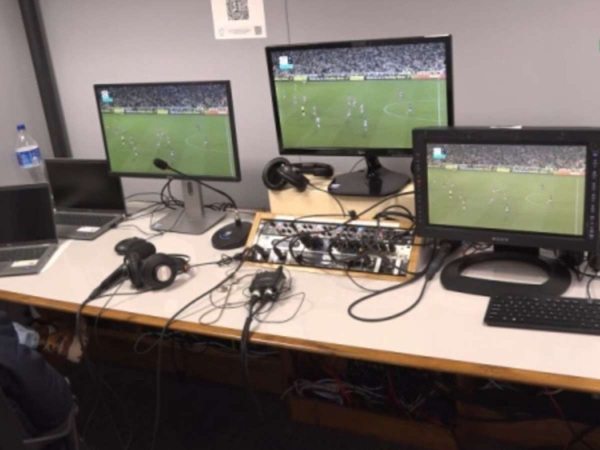 A partida até estava passando em três telas, mas todos os fones de ouvidos estavam na mesa sem ninguém escutando o que acontecia.