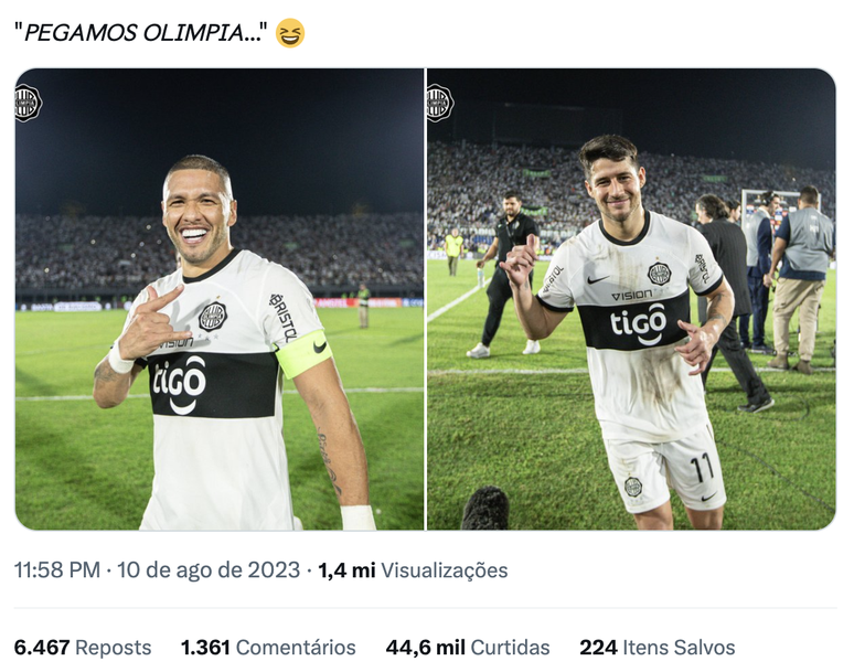 "Pegamos o Olimpia (comemorou). Palmeiras x Galo. (risadas) Athletico na altitude (contra o Bolívar). Pegamos o Olimpia, garoto! Flamengo e Olimpia nas oitavas da Libertadores. Eu não acredito. Sensacional! Pegamos o Olimpia. Graças a Deus. Palmeiras e Atlético Mineiro. Espetacular. Pegamos o Olimpia, galera. Vai dar tudo certo", disse, na ocasião.