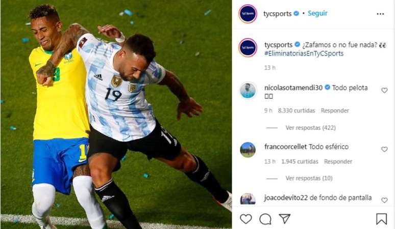 O zagueiro Nicolás Otamendi apelou à ironia após dar uma cotovelada em Raphinha no empate entre Argentina e Brasil em 0 a 0, na última terça-feira, em San Juan, pelas Eliminatórias sul-americanas para a Copa do Mundo de 2022, no Catar. Em uma publicação do canal TyC Sports, que questionava se o lance era passível de expulsão, o defensor comentou que não foi falta: "Todo pelota" ("só bola", em português).