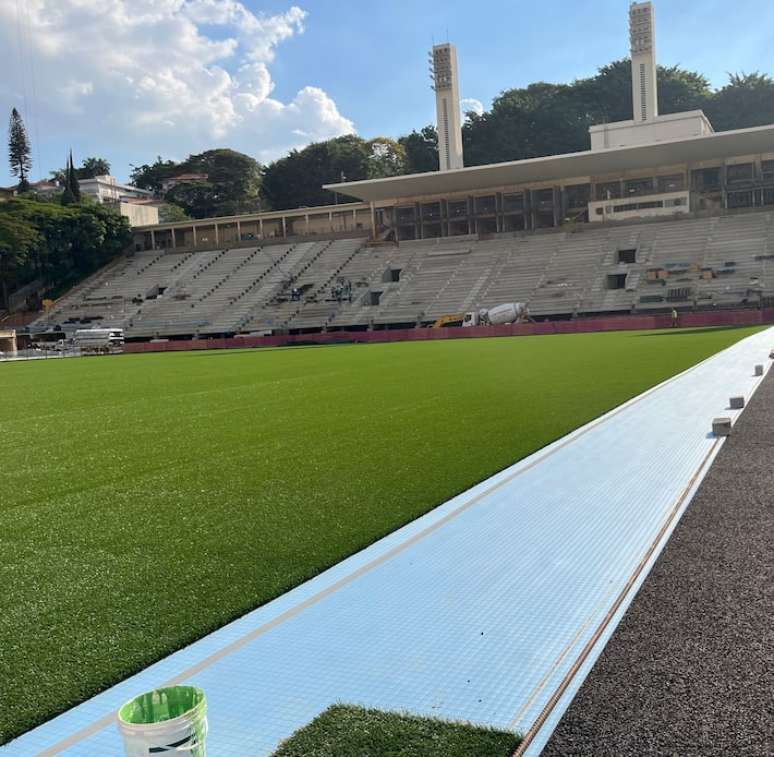 Quase três anos após o inícios das obras de modernização, o Pacaembu recebeu nos últimos dias o tão esperado gramado onde serão disputadas as partidas da nova era do tradicional estádio paulistano. Trata-se de um campo sintético produzido nos Estados Unidos, cujo material é composto por cortiça manufaturada. Informação foi divulgada pelo ge e confirmada pelo Estadão. De acordo com a Allegra Pacaembu, concessionária detentora da outorga do local, a previsão é de reabrir o estádio em julho deste ano.