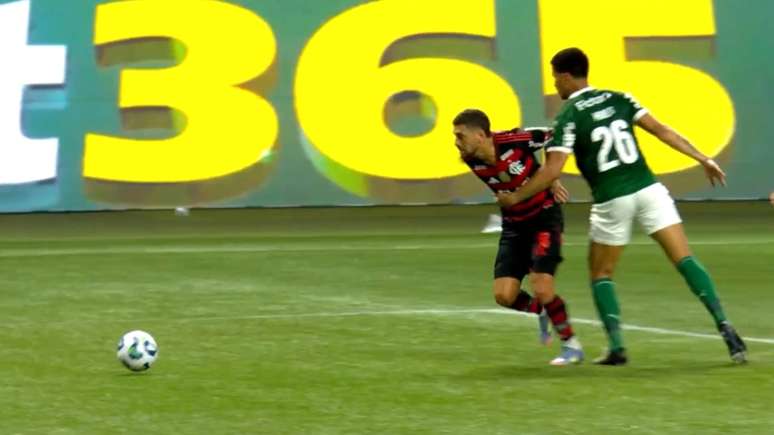 No segundo tempo, a marcação da penalidade foi a favor do Flamengo. Arrascaeta caiu na área após toque de Murilo. Ramon Abatti Abel, no campo, mandou o jogo seguir, mas foi recomendado pelo VAR a analisar o lance.