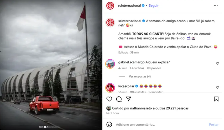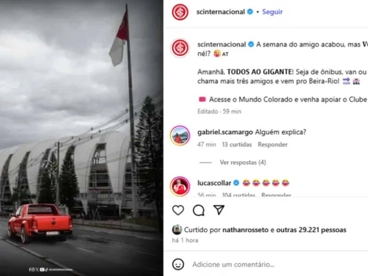 "Amanhã, TODOS AO GIGANTE! Seja de ônibus, van ou Amarok, chama mais três amigos e vem pro Beira-Rio!", diz a publicação do Inter. O jornalista rebateu também de maneira irônica. "Amizade é tudo", escreveu Léo Dias, seguido com um emoji com dois olhinhos.