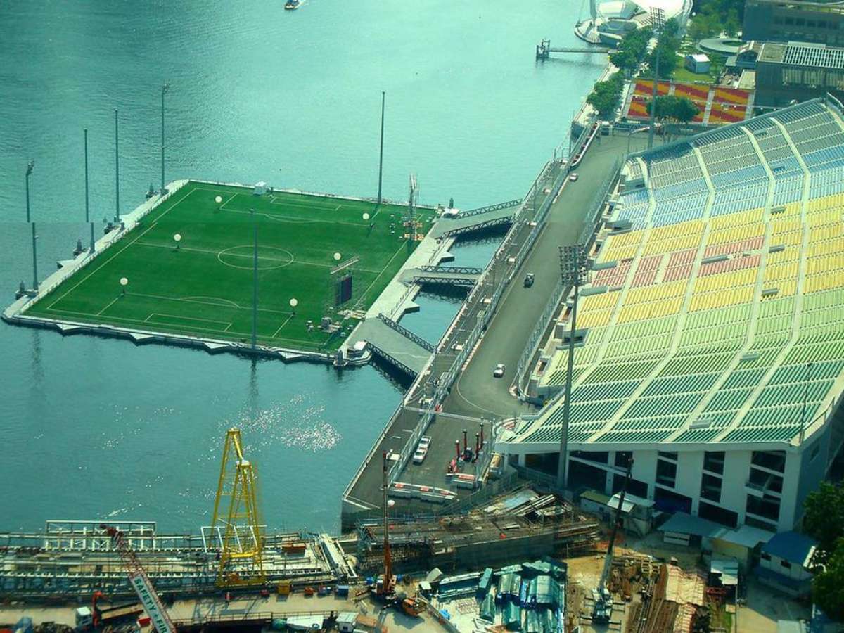Um campo de futebol sobre o mar. Ele existe em Marina Bay, em Cingapura. O estádio Flutuante Mariana Bay, também conhecido por Plataforma Flutuante, foi fundado em 2007 e sediou os Jogos Olímpicos da Juventude, em 2010. As arquibancadas ficam na parte insular de Cingapura, enquanto o campo foi construído na baía. A plataforma pode aguentar um peso equivalente a nove mil pessoas.Estádio Cierny Balog