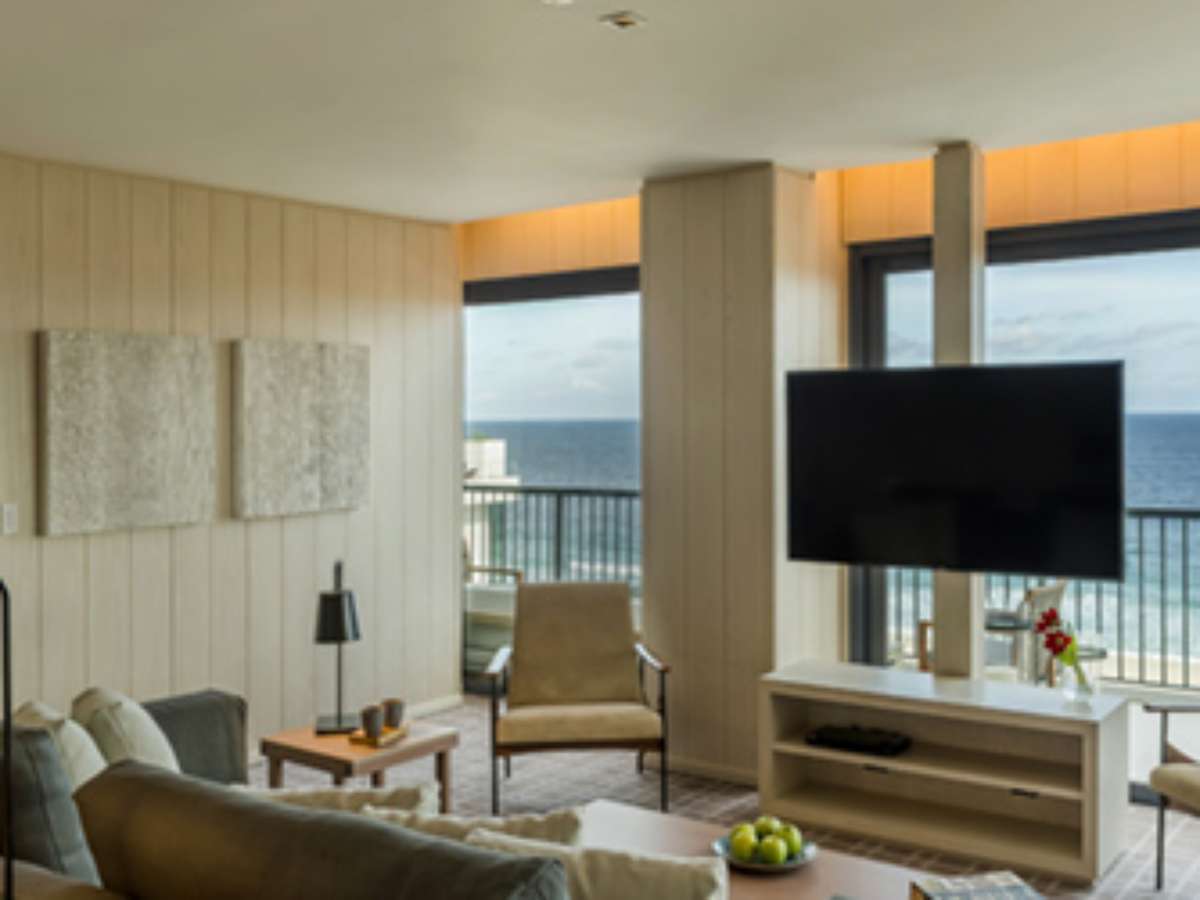O quarto tem 120 m² e vista privilegiada para o mar, além de salas de estar e de jantar, banheiro com banheira de imersão e acesso ao exclusivo Grand Lounge, que oferece café da manhã, lanches e coquetéis, alcoólicos e não-alcoólicos, ao longo do dia.