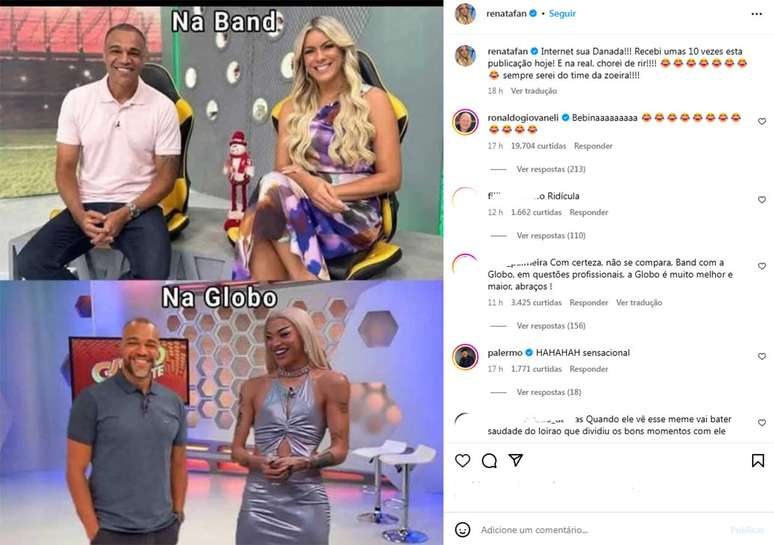 Na intenção de comparar o antigo e o novo ambiente de trabalho do ex-jogador, a jornalista compartilhou uma montagem. Na primeira foto, o ex-atleta está ao lado de Renata Fan, na emissora do bairro do Morumbi, em São Paulo. Em seguida, no outro registro, o profissional de comunicação divide o cenário da edição paulista da atração "Globo Esporte" com a artista Pablo Vittar.