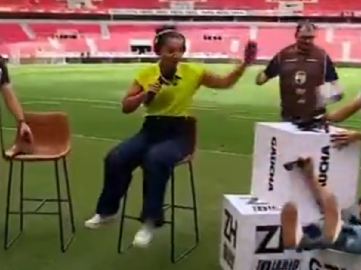 Repórter de afiliada da Globo cai dentro de decoração em pré-jogo do Grenal; assista