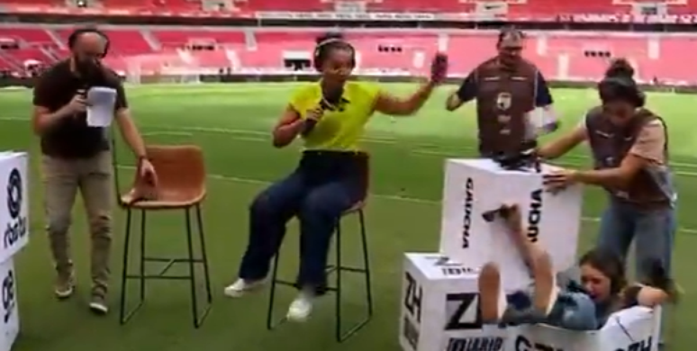 Quando Valéria Possamai, repórter da RBS TV, ajustava o cubo, ela acabou caindo dentro da decoração, o que levou todos os integrantes ao riso.