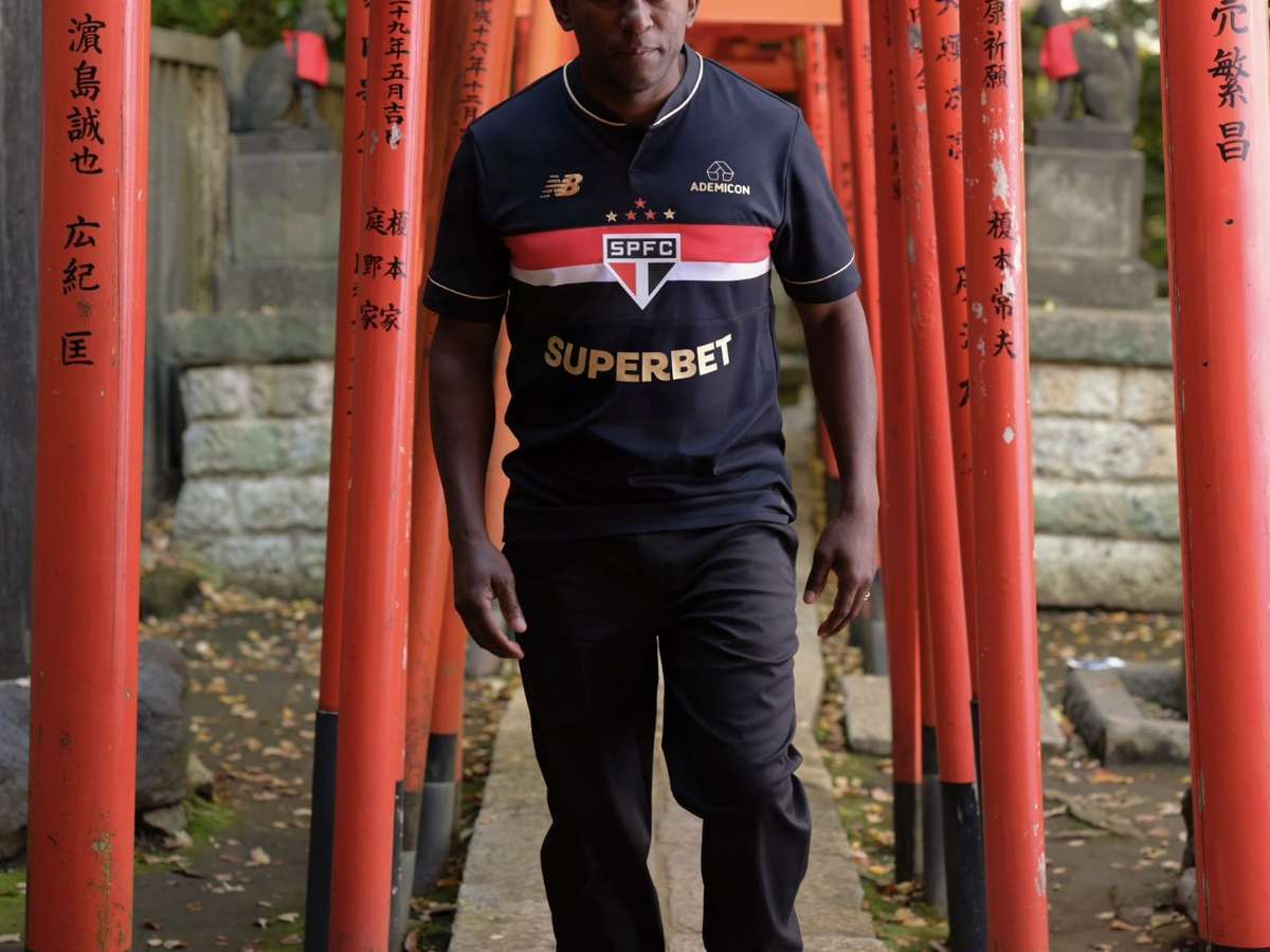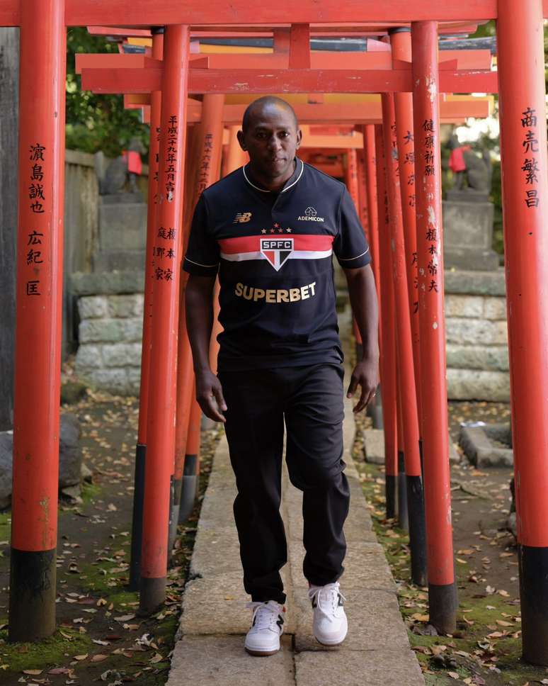 O interior do escudo carrega a escrita em japonês "São Paulo FC/Tu és forte, tu és grande", em referência ao hino. Na barra, o brasão com flores de cerejeira, típicas do Japão, além de outros ícones especiais. Para completar, as três estrelas no escudo, assim como o logotipo da New Balance e dos patrocinadores, foram confeccionadas em dourado cromado.