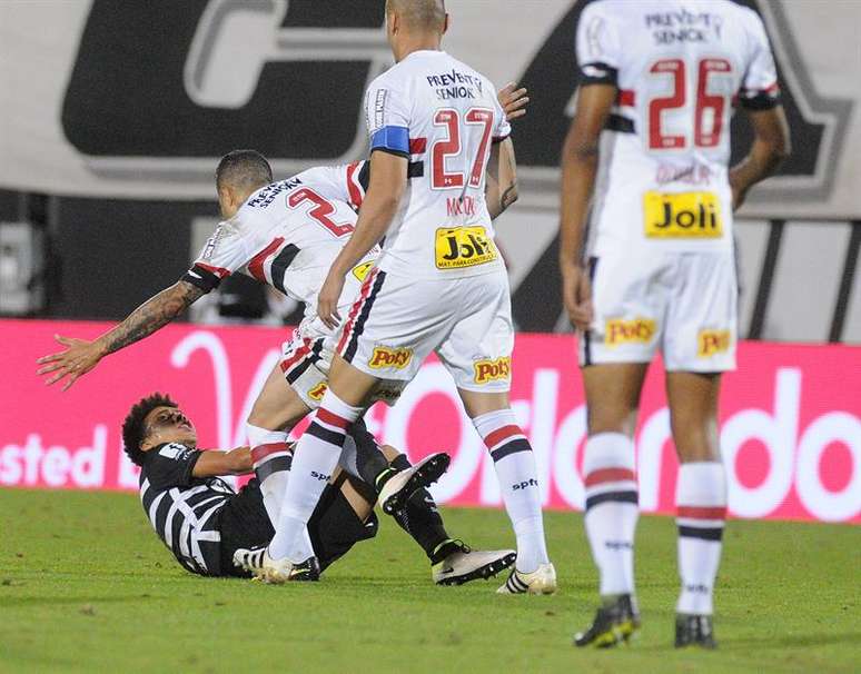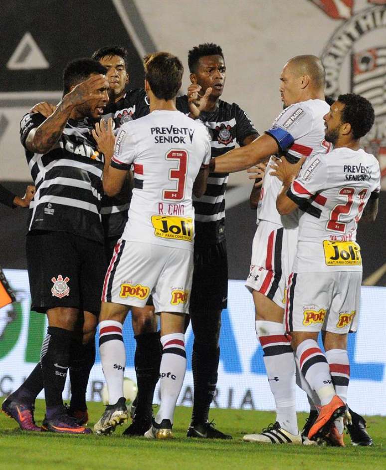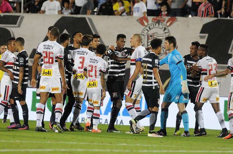 As observações, no entanto, só duraram os primeiros 19 minutos, parte do jogo em que os são-paulinos retiveram a bola e os corintianos conseguiram fechar bem os espaços. O ponto determinante foi um lançamento para Marquinhos Gabriel no ataque corintiano. Atento, Bruno conseguiu vencer o alvinegro na corrida e jogou a bola para a linha lateral. Tudo normal até o momento em que o lateral deu um chute na cabeça do corintiano, desencadeando uma confusão em campo.