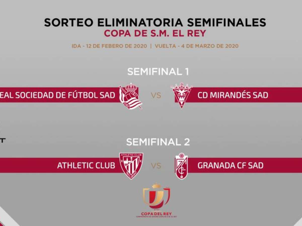 Pela primeira vez em 10 anos sem Barcelona ou Real Madrid na disputa pelo título, a Copa do Rei conheceu nesta sexta-feira os confrontos das semifinais, que serão disputado em jogos de ida e volta. Em um sorteio realizado na sede da Real Federação Espanhola de Futebol (RFEF, na sigla em espanhol), em Madri, ficou definido que a Real Sociedad enfrentará o Mirandés, da segunda divisão, e o Athletic Bilbao jogará contra o Granada.