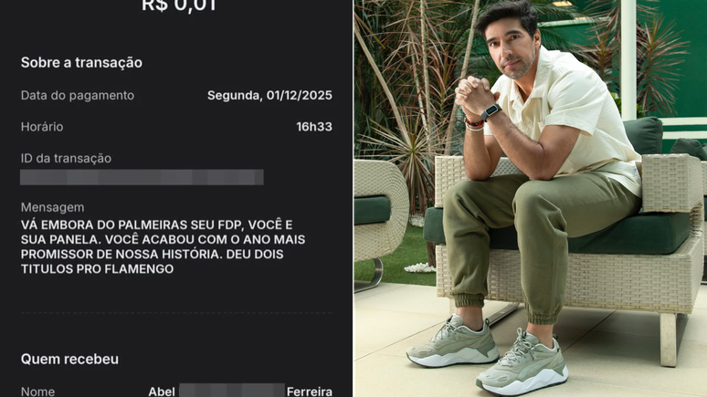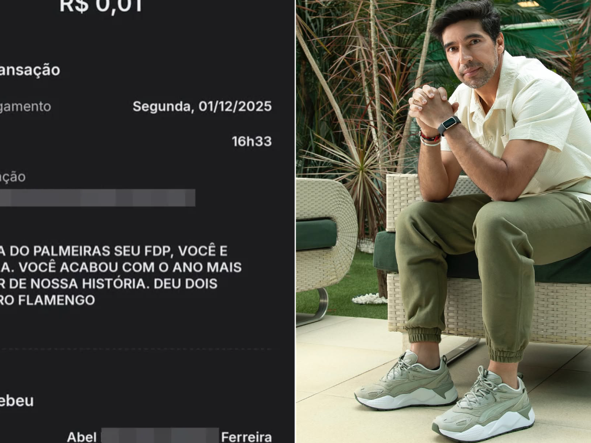 Em uma delas, sob o valor de R$ 0,01, a mensagem anexa diz: “Vá embora do Palmeiras [sic], seu fdp, você e sua panela. Você acabou com o ano mais promissor de nossa história. Deu dois títulos para o Flamengo.”