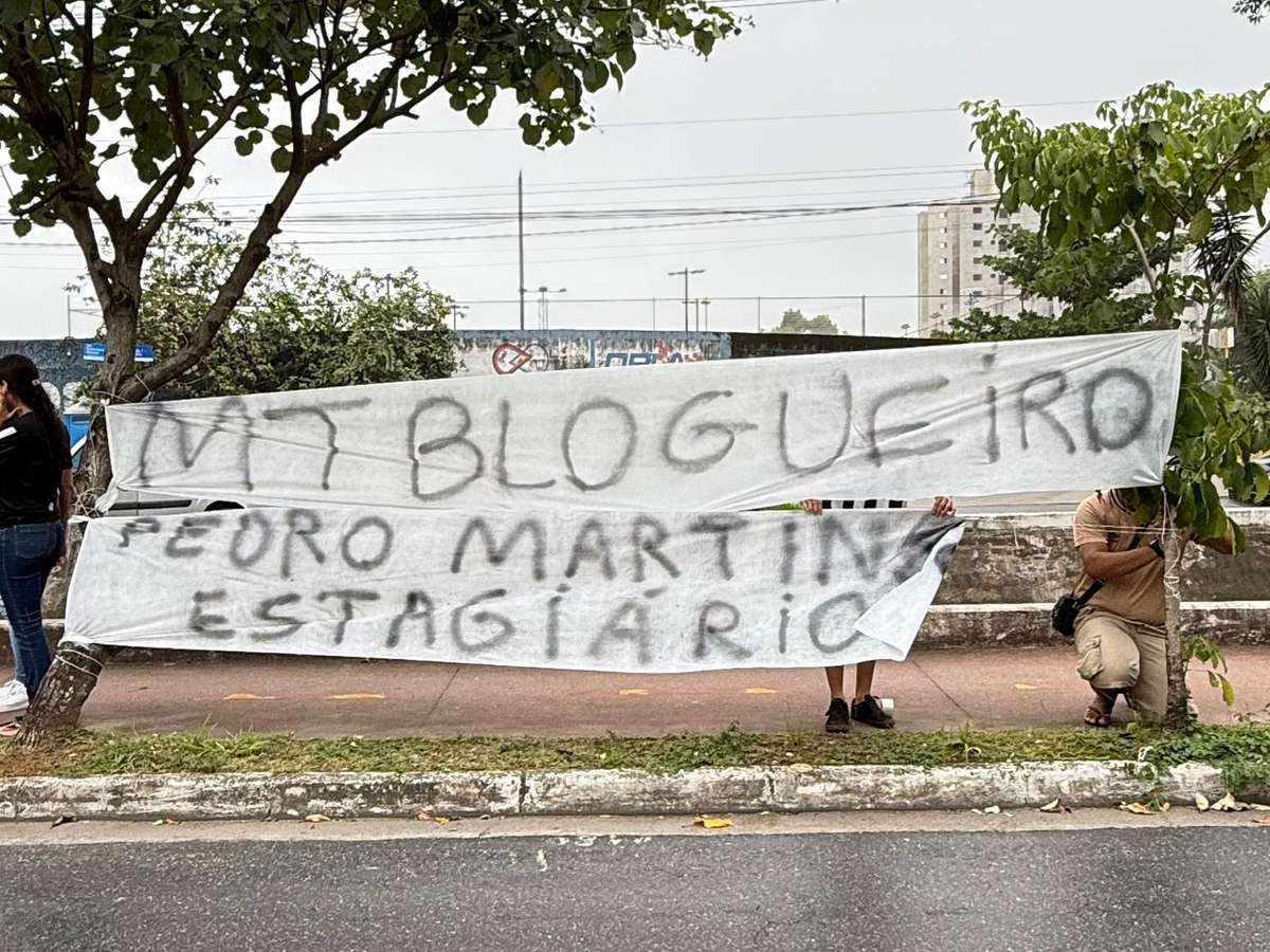 Um grupo de torcedores levou faixas contra o presidente Marcelo Teixeira, seu filho e CEO do clube, Pedro Martins em frente ao CT.