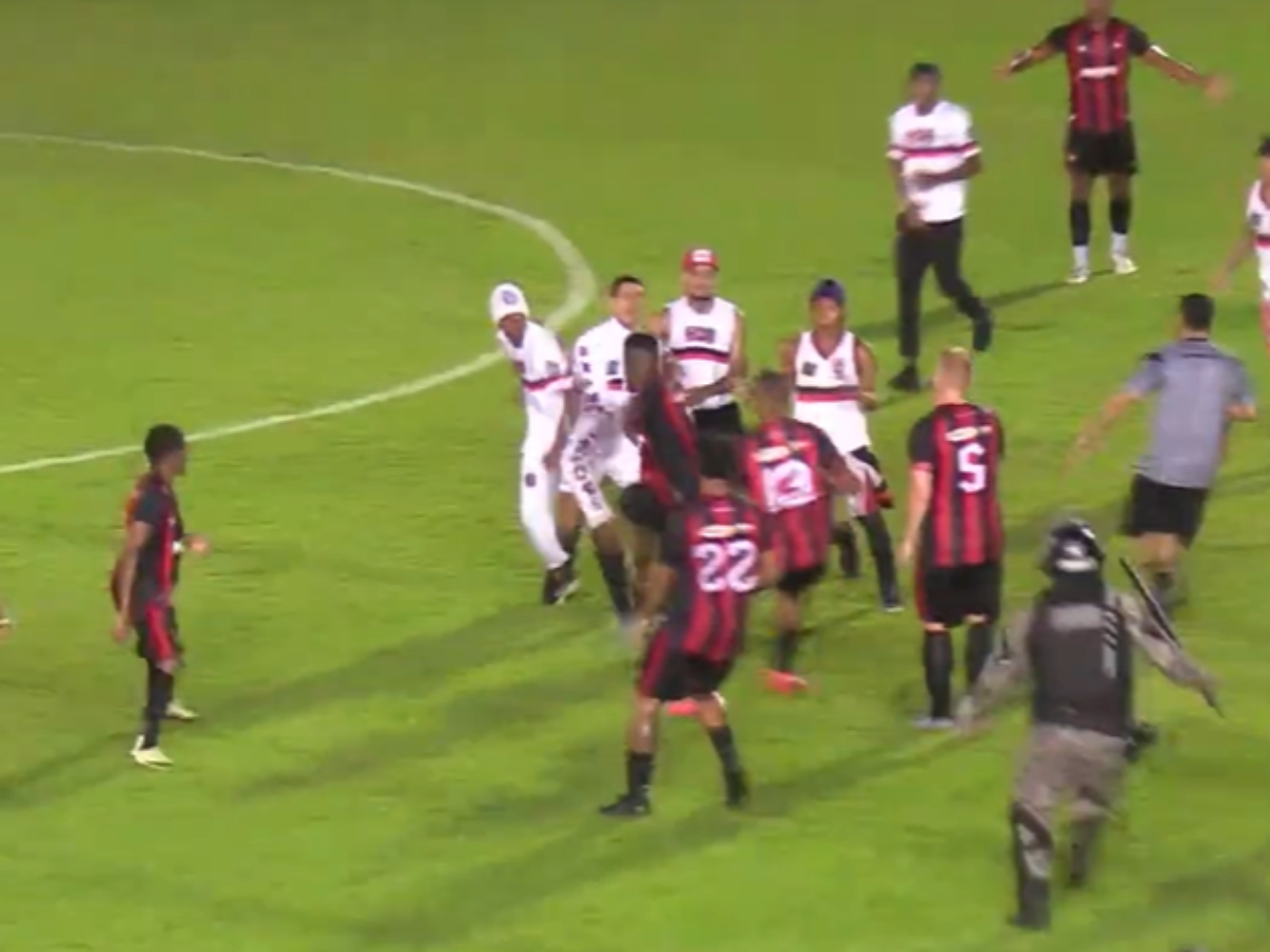 Alguns atletas chegaram a revidar e entrar em luta corporal contra os torcedores. Com a ‘treta’ rolando, policiais entraram no gramado e usaram spray de pimenta para espantar os invasores.