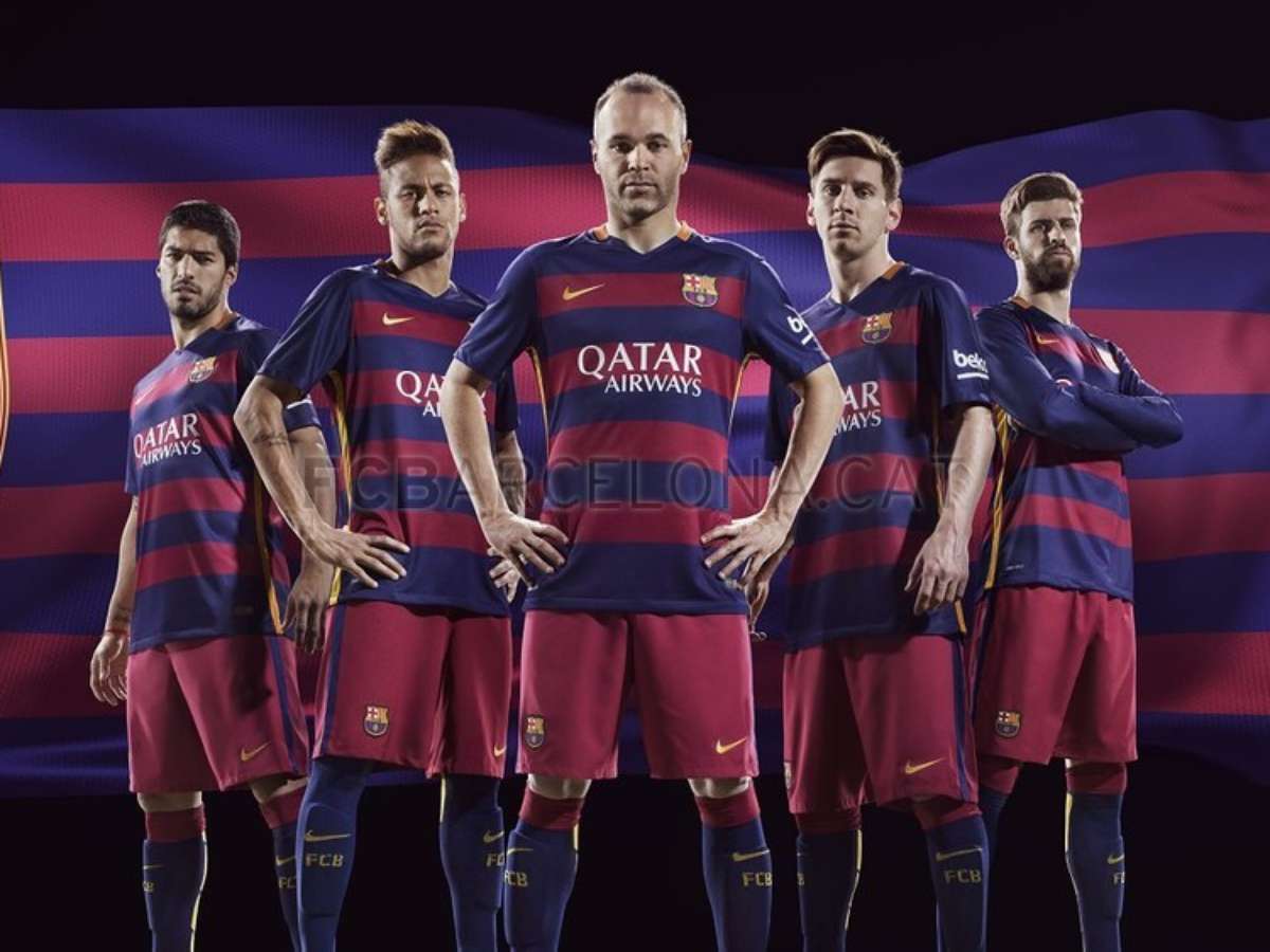 As imagens já tinham vazado na internet há algum tempo, mas foi neste domingo que o Barcelona divulgou oficialmente o novo uniforme para a temporada 2015/2016. Usando como modelo o trio de ataque - formado por Messi, Neymar e Suárez -, além de Iniesta e Pique, o clube apresentou uma camisa com desenho inovador.