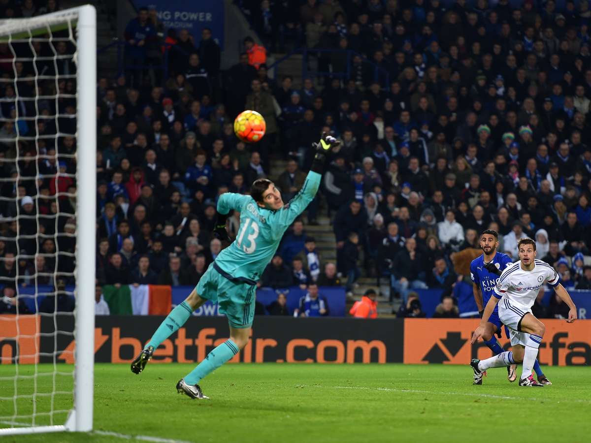 O jogo - O embalado Leicester aproveitou o apoio de sua torcida e partiu para cima do Chelsea desde o início. Logo aos dois minutos, Riyad Mahrez fez uma bela jogada e disparou o chute, mas parou em defesa segura do goleiro Courtois.