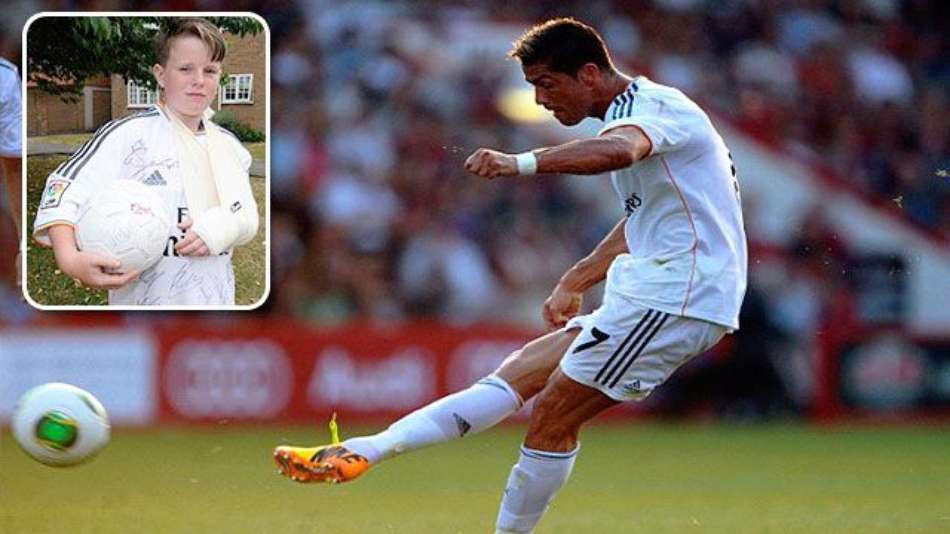 Futebol Cristiano Ronaldo quebra braço de criança com bolada; veja Exibir comentários Compartilhar No amistoso do Real Madrid contra o Bornemouth, o astro português errou o chute e machucou o menino inglês Charlie Silverwood, de 11 anos Reprodução Publicidade