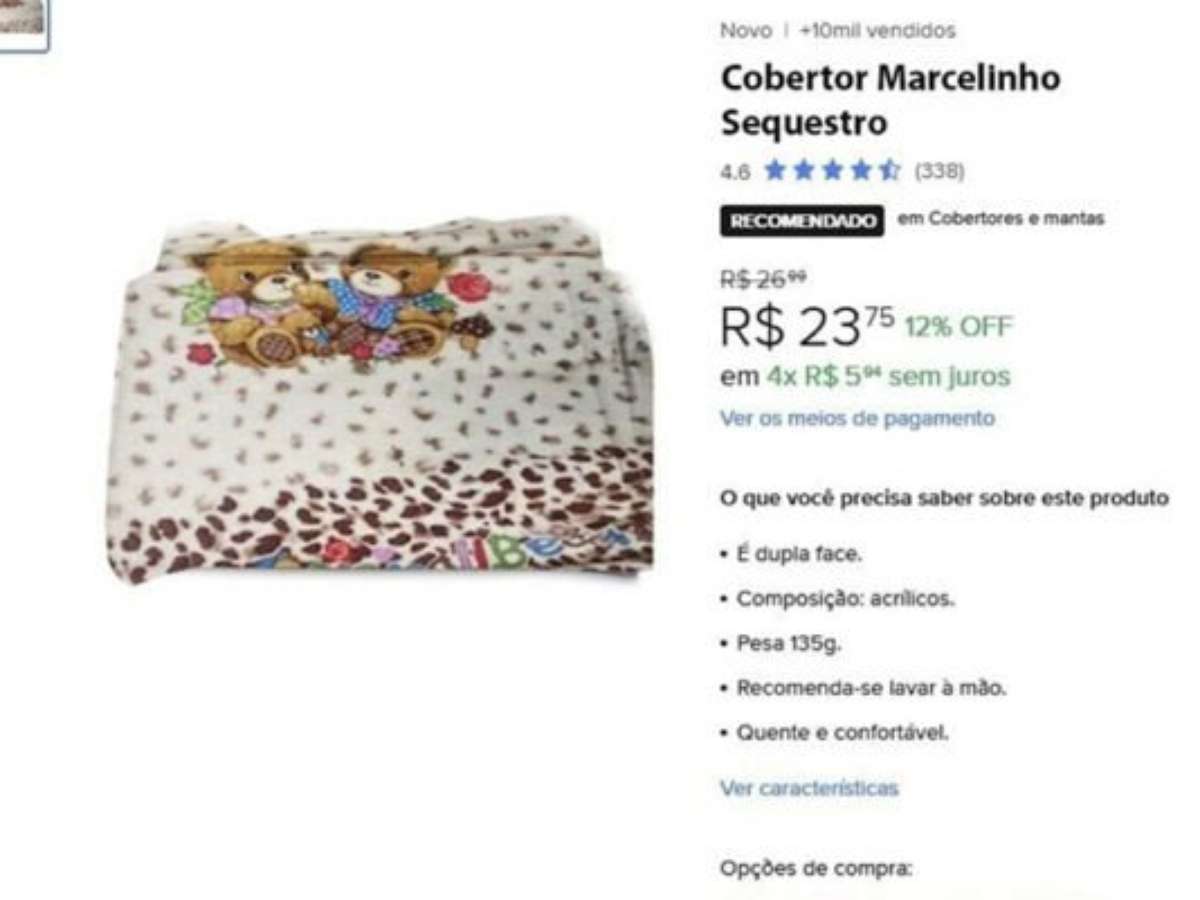 Fuincionários do Mercado Livre anunciaram, na plataforma, a venda de um cobertor, com ursinhos. O título é: "Cobertor Marcelinho Sequestro". A imagem bombou no Twitter.