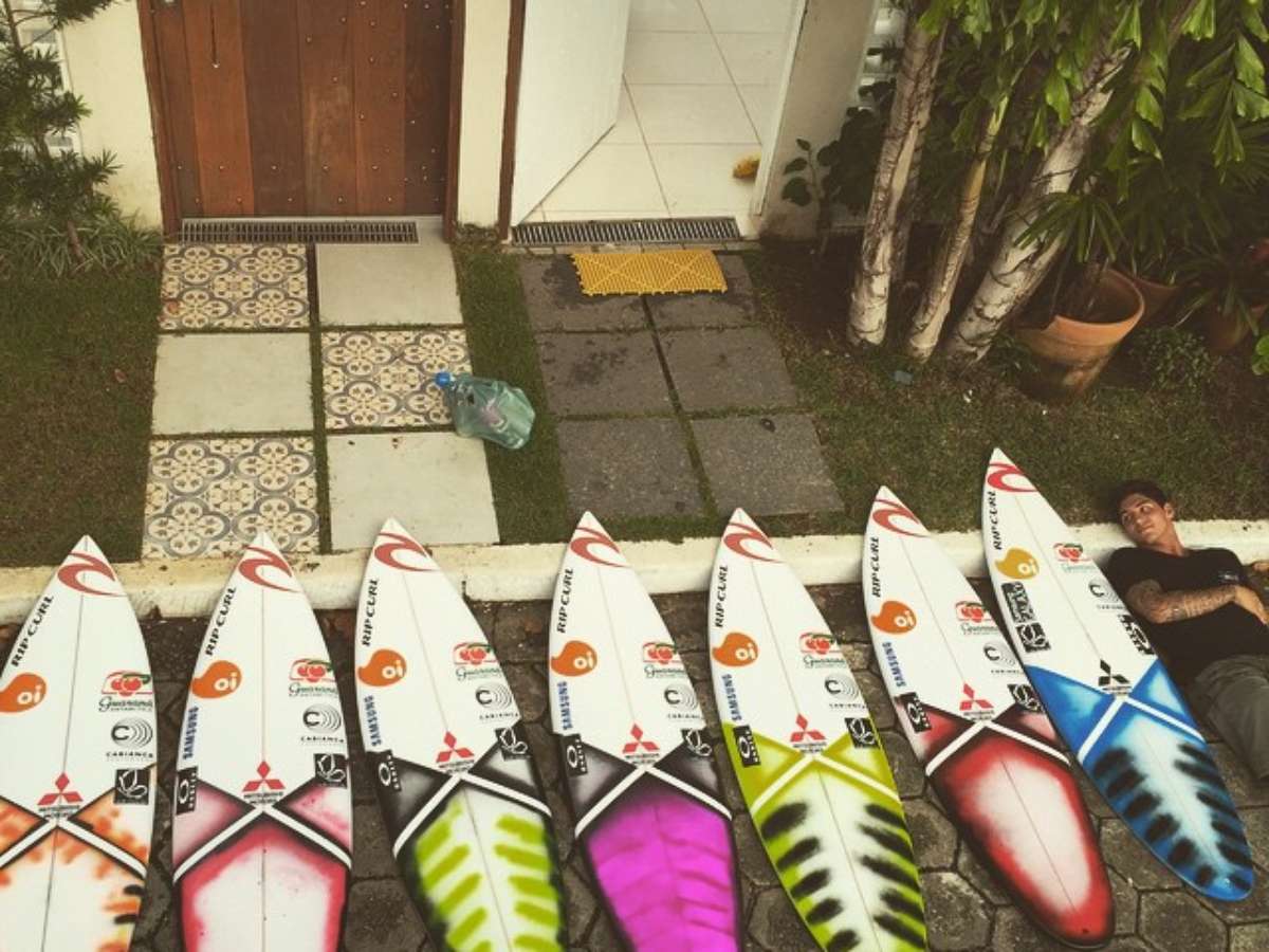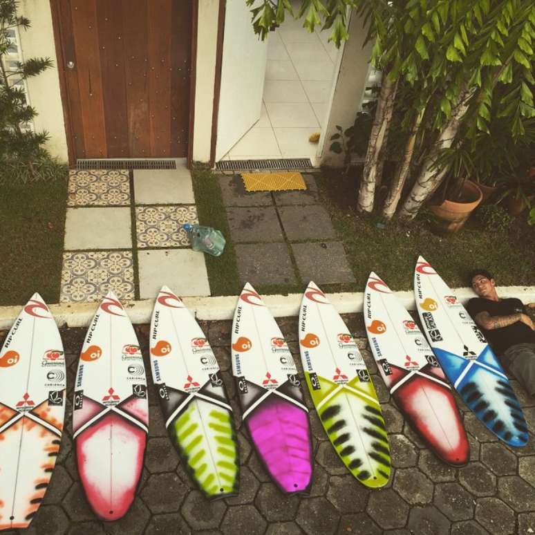 O surfista de 21 anos optou pela arte do grafite em suas pranchas, que chamam a atenção pelas cores fortes, como o verde limão, rosa e vermelho. Medina ainda agradeceu os companheiros de profissão, os irmãos Miguel (também disputa o Mundial) e Samuel Pupo: "obrigado @samuelpupo_official e @miguelpuposurf pelas artes!!!!".