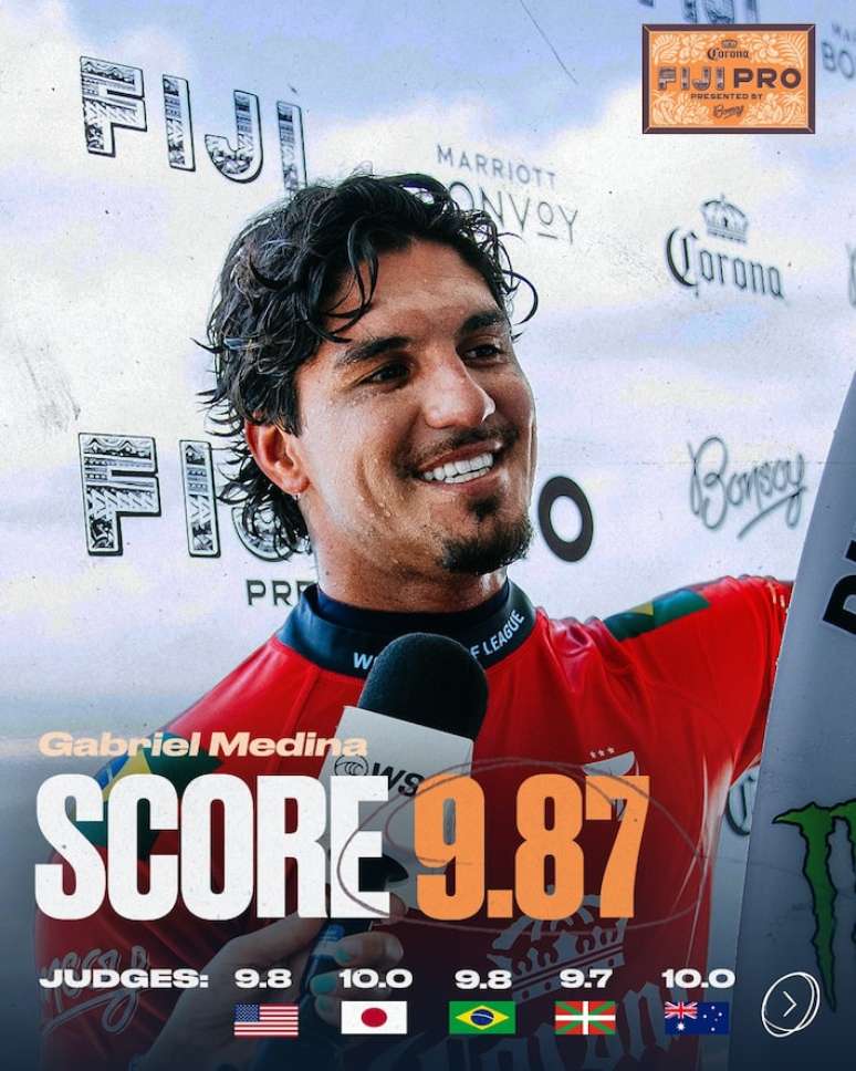 A manobra foi tão bonita que, após sair do tubo, Medina saiu com os dez dedos em riste nas duas mãos, pedindo por uma nota 10 para os juízes. Os árbitros, no entanto, não concordaram com o pedido do surfista e acabaram dando um 9,87 para a manobra.