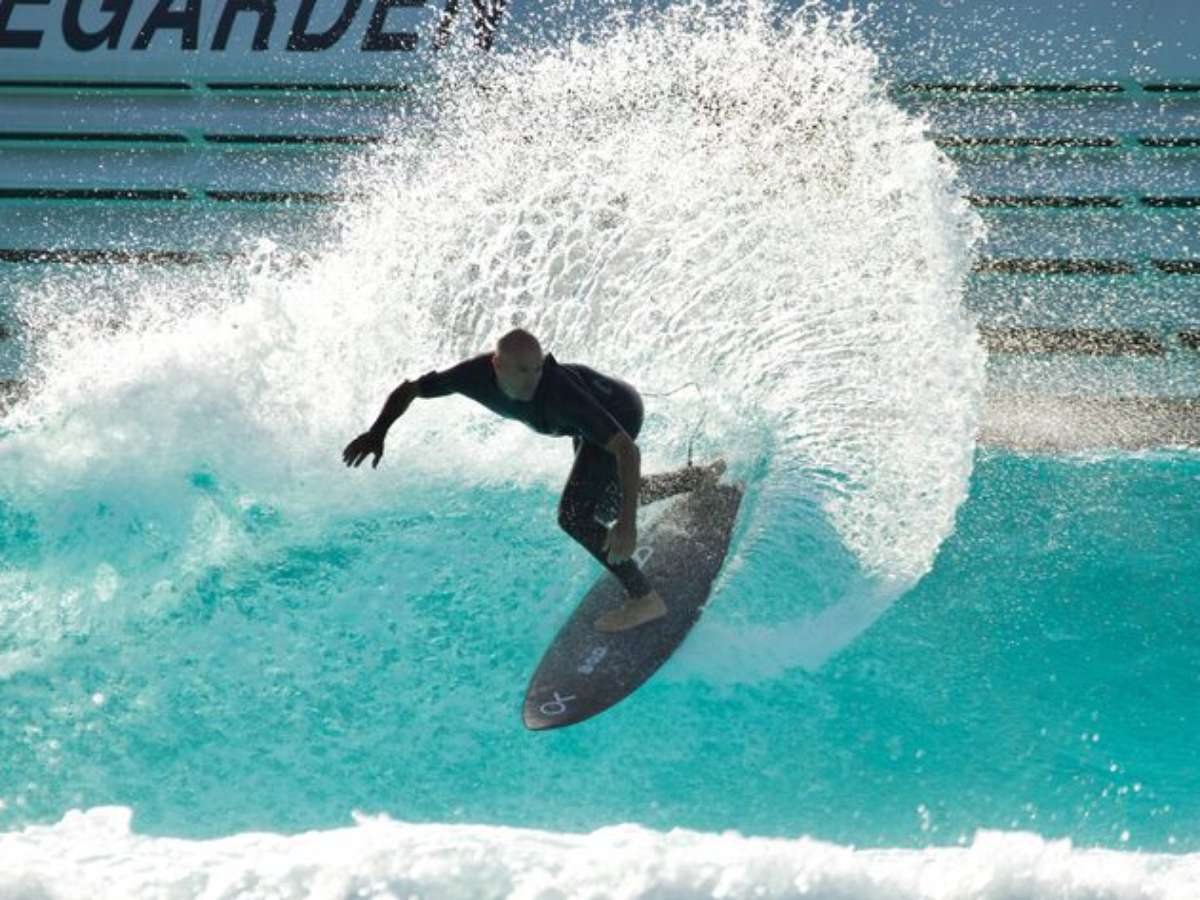 Slater veio ao Brasil para participar da Expert XP, feira voltada ao mercado de investimentos, e aproveitou o tempo livre para testar a piscina antes da inauguração oficial, prevista para outubro deste ano.