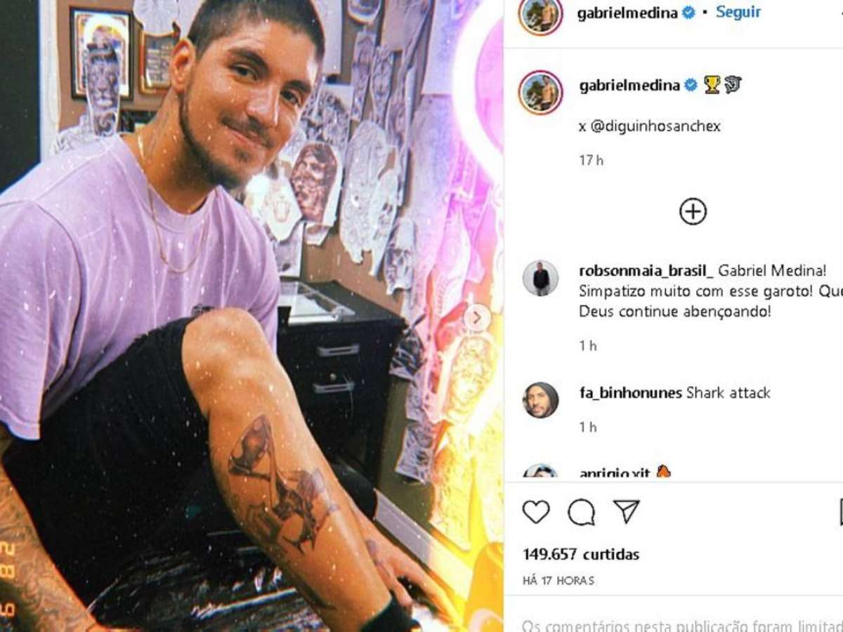 Gabriel Medina divulgou em sua conta no Instagram a tatuagem que fez em sua perna direita do troféu do tricampeonato mundial. O surfista também desenhou um tubarão, representando o animal que interrompeu por 15 minutos a segunda bateria contra o compatriota Filipe Toledo no WSL Finals, no mês passado.