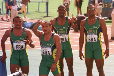 - Cláudio de Souza, Vicente Lenílson, André Domingos da Silva e Edson Luciano Ribeiro (da esq. para dir.), depois de garantirem o Brasil na semifinal do revezamento 4 x 100 m