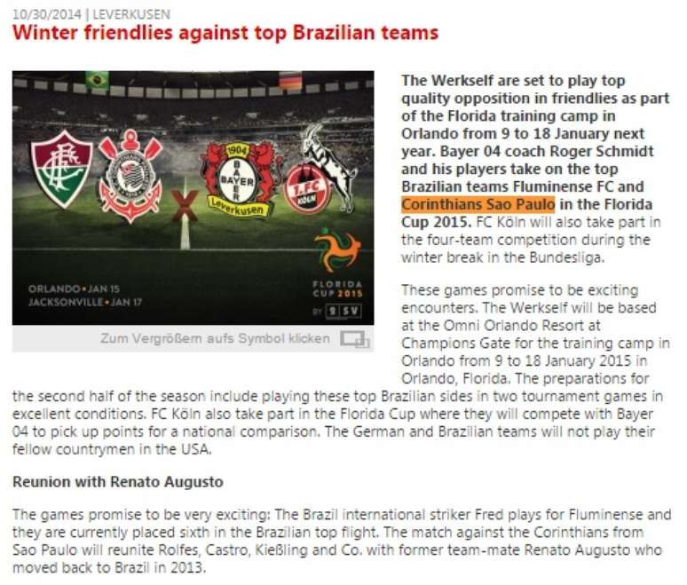 Em outubro, o Bayer Leverkusen divulgou em seu site oficial a tabela da Florida Cup, que reunirá o clube alemão, o compatriota Colônia, e os brasileiros Corinthians e Fluminense em quadrangular amistoso em janeiro do ano. No entanto, ao publicar a nota, um fato curioso despertou a atenção. Logo no começo do texto, quando estão apresentando os clubes, o alvinegro paulista é chamado de "Corinthians São Paulo". A infelicidade do Leverkusen, que acabou colocando um dos maiores rivais do clube de Parque São Jorge em seu nome, foi corrigida nos paragráfos seguintes, quando deixaram claro que queriam dizar que o clube era da capital São Paulo. "A partida contra o Corinthians, de São Paulo, reunirá Rolfes, Castro, Stefan Kiessling e companhia com o ex-companheiro de clube Renato Augusto, que retornou ao Brasil em 2013". (Veja mais neste link)