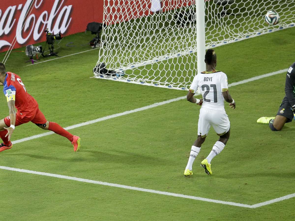 A alegria de Gana não durou muito tempo: John Brooks cabeceia a bola e marca o segundo gol americano, garantindo a vitória por 2 a 1 em cima de Gana