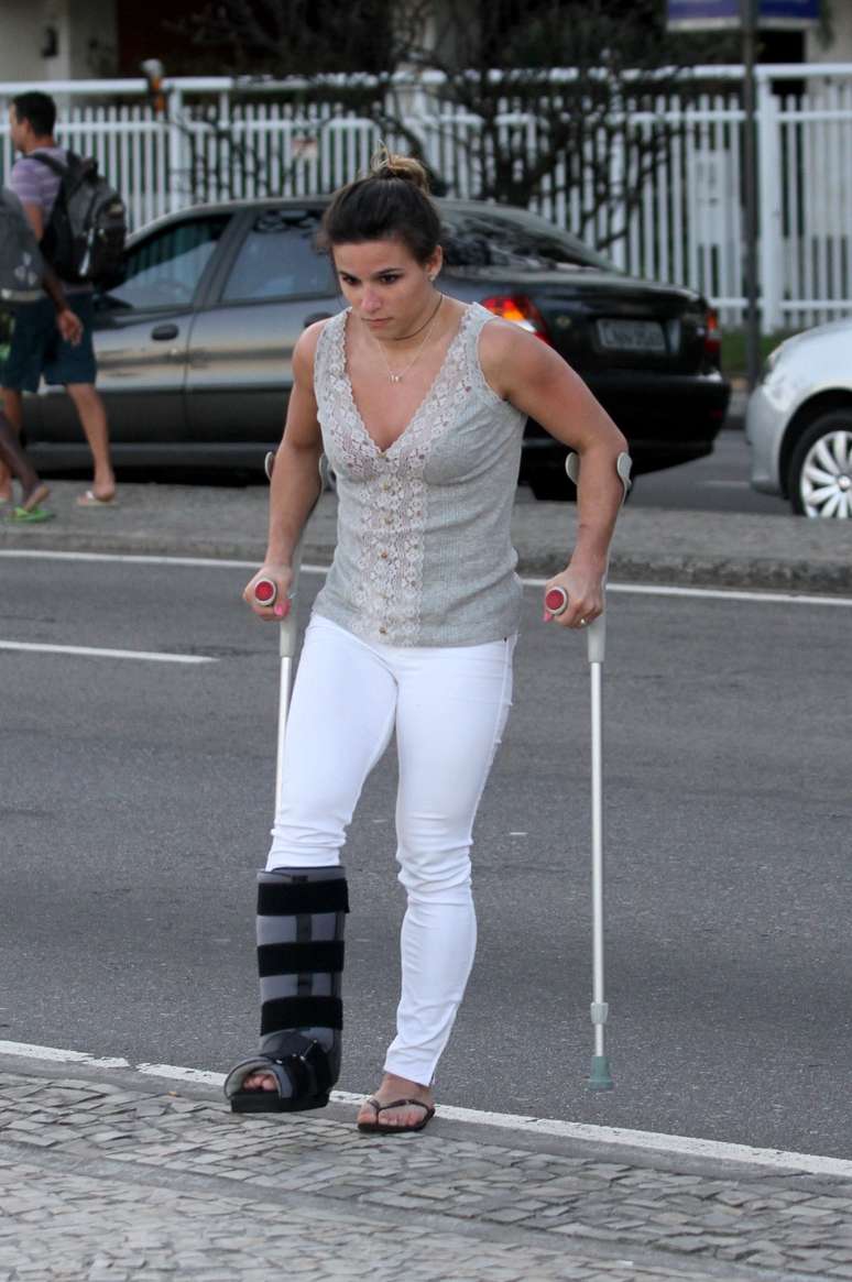 A ginasta Jade Barbosa passeou na tarde da última quarta-feira pela orla do Leblon, no Rio de Janeiro, com o pé direito imobilizado. A atleta rompeu ligamento do tornozelo durante o treinamento da última terça no Centro de Excelência em Ginástica (Cegin), em Curitiba (PR), e deve ficar fora do Mundial da Bélgica, entre 30 de setembro e 6 de outubro.