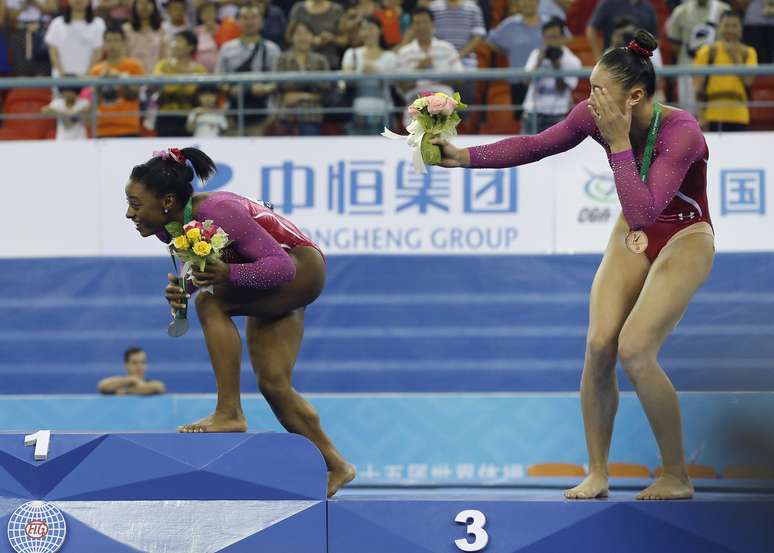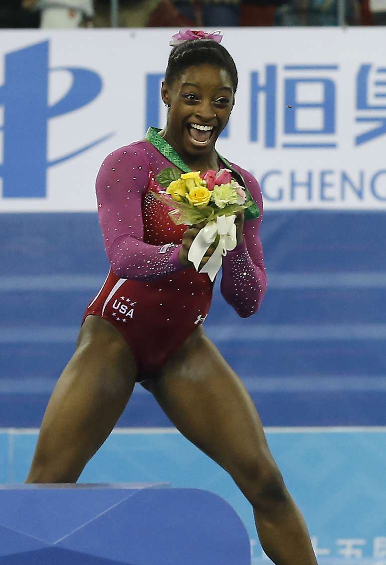 A americana Simone Biles, 17 anos, sagrou-se bicampeã mundial nesta sexta-feira no individual geral de ginástica artística, em Nanning, na China. Mas a garota-prodígio que se projeta no ar em meio a piruetas e se equilibra habilmente em barras elevadas mostrou que também pode ter medo de algo bastante simples: uma abelha. Na premiação do pódio, o inseto saiu voando do buquê dado a Biles e assustou a atleta, que correu e jogou as flores no chão.