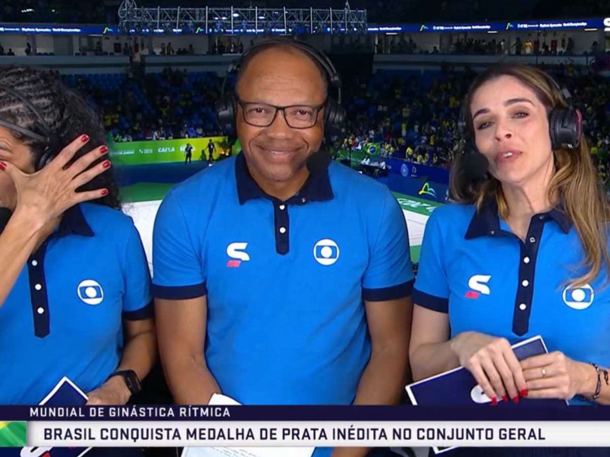As comentaristas Renata Teixeira e Juliana Coradine não seguraram as lágrimas com a medalha de prata do Brasil no Mundial de ginástica rítmica. Duda Arakaki, Nicole Pircio, Sofia Madeira, Mariana Gonçalves e Maria Paula Caminha conquistaram o pódio inédito neste sábado, 23, na Arena Carioca 1, no Parque Olímpico do Rio de Janeiro.