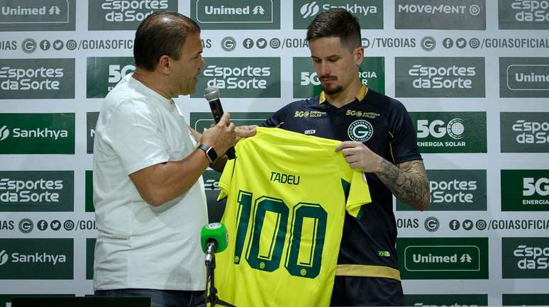 A noite da última quarta-feira (18), foi mais que especial para o goleiro Tadeu, do Goiás. No jogo contra o São Paulo, o capitão e jogador do atual elenco com o maior número de jogos pelo clube, alcançou uma marca inédita. Tadeu chegou aos 100 jogos no Estádio Hailé Pinheiro, popularmente conhecido como Serrinha e Casa do Verdão. Após o jogo, em coletiva para recebimento de placa comemorativa pela marca, Tadeu celebrou o feito e exaltou a vitória sobre a equipe paulista.