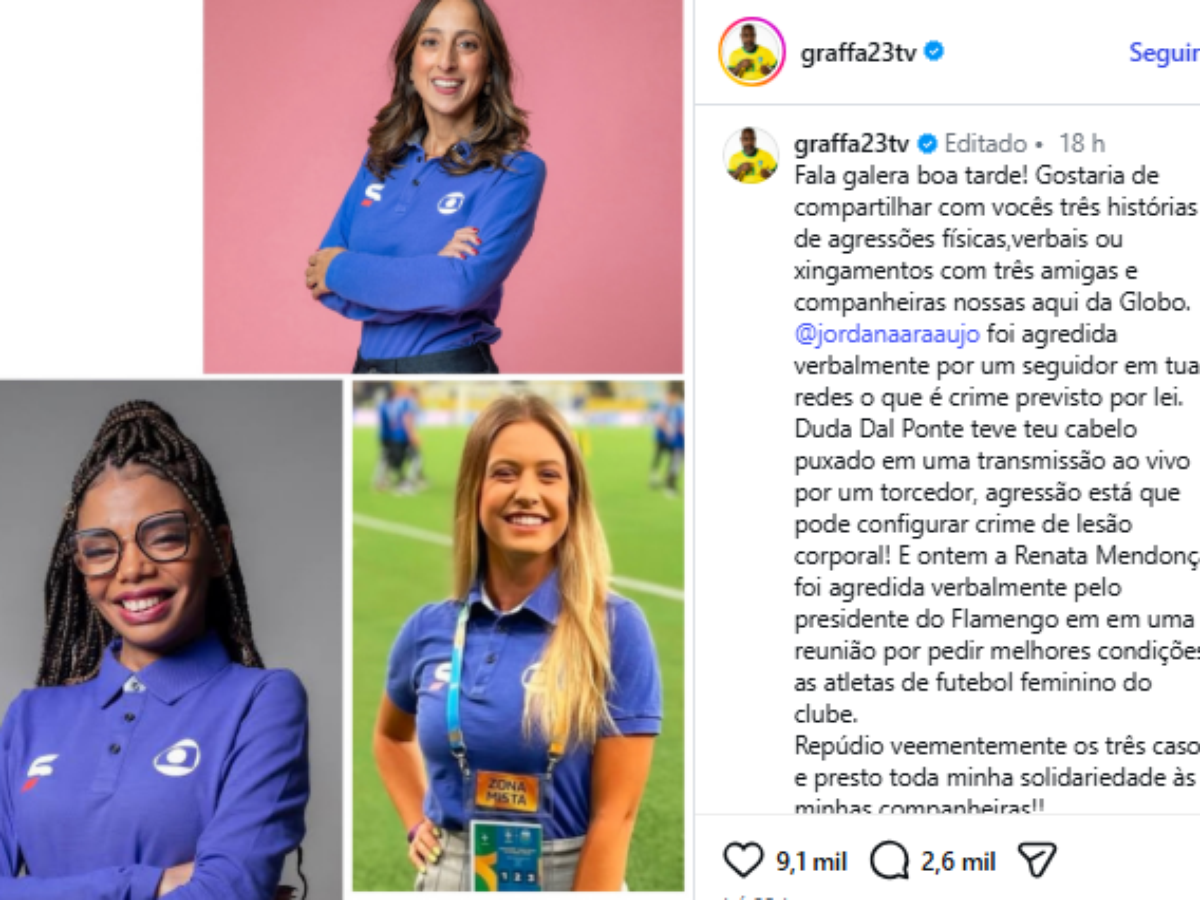 Em sua conta no Instagram, o ex-jogador prestou solidariedade não só à Renata, mas também relembrou outros dois casos ocorridos com as jornalistas Jordana Araújo e Duda Dal Ponte, que recentemente foram vítimas de agressões físicas e verbais.