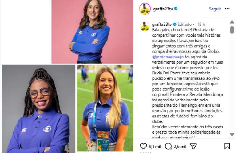 "Jordana Araújo foi agredida verbalmente por um seguidor em tuas redes o que é crime previsto por lei. Duda Dal Ponte teve teu cabelo puxado em uma transmissão ao vivo por um torcedor, agressão está que pode configurar crime de lesão corporal! E ontem a Renata Mendonça foi agredida verbalmente pelo presidente do Flamengo em em uma reunião por pedir melhores condições as atletas de futebol feminino do clube. Repudio veementemente os três casos e presto toda minha solidariedade às minhas companheiras!!", complementou.