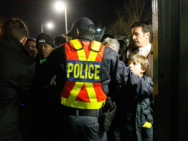 Johannesburgo, 15 de junho: Torcedores discutem com a polícia para tentar entrar no estádio minutos antes do duelo de estreia do Brasil diante da Coreia do Norte, no Ellis Park, em Johannesbugo. A falha no sistema de energia travou as catracas, atrapalhando a entrada de milhares de fãs. Foto: AP
