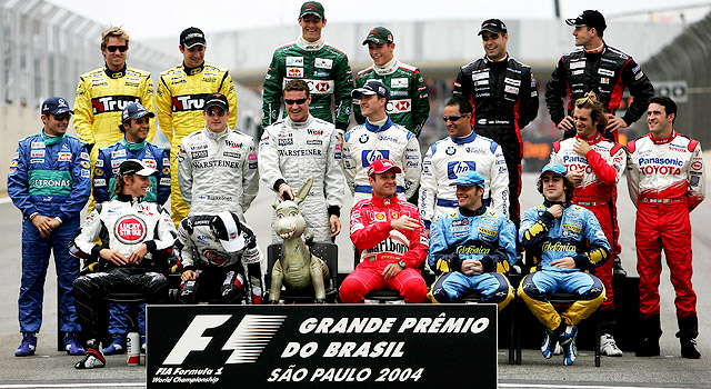 Burro rouba a cena em foto coletiva dos pilotos para o GP do Brasil de 2004