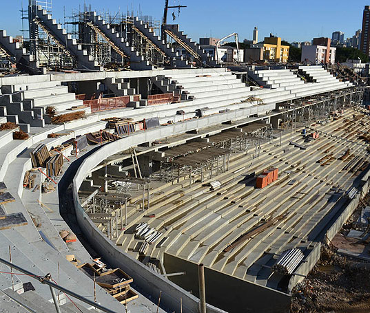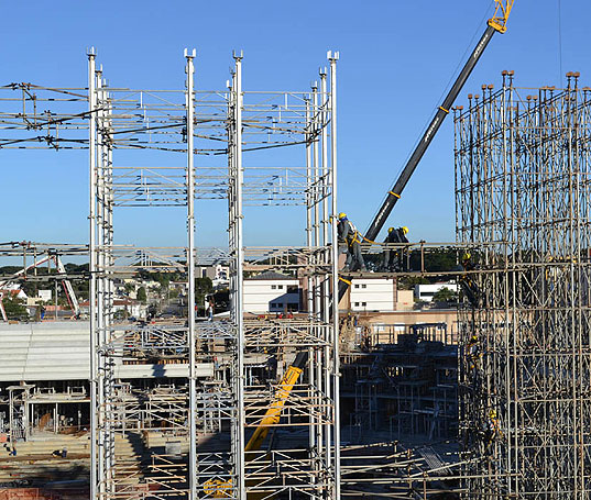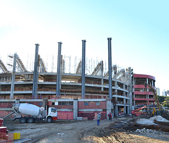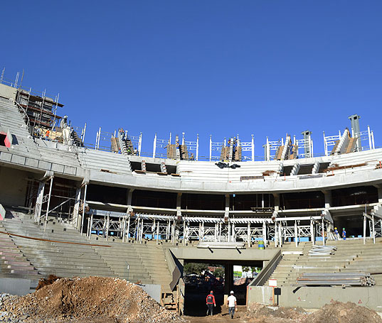 Situação da obra: Além de um lance novo de cadeiras, o foco das obras é a construção da cobertura. O espaço que seria do gramado recebe atualmente a montagem dos andaimes que servirão para a montagem da cobertura. Serão 17 torres de cada lado, sendo 11 dentro do campo e 6 sobre as arquibancadas. Já foram desapropriadas casas na região do estádio para que os trabalhos possam seguir.