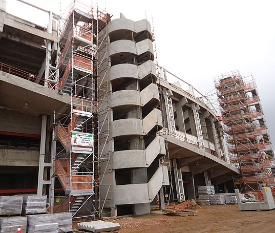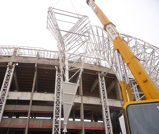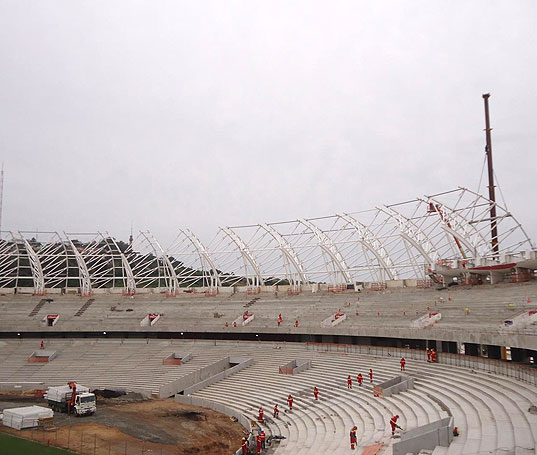 Situação da obra: O principal foco das obras atualmente é na cobertura, que tem trabalhos na montagem das folhas metálicas e nas torres de circulação. A construtora já finalizou as alvenarias da área que será destinada ao shopping que o Beira-Rio abrigará.