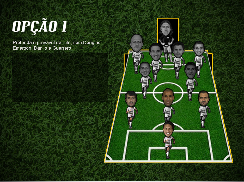 O Corinthians está a menos de um mês para fazer sua estreia no Mundial de Clubes, e o técnico Tite ainda quebra a cabeça para decidir quem será o quarteto titular do ataque alvinegro na competição. Adepto do esquema 4-2-3-1, o comandante já sabe quem irá compor a escalação nas sete primeiras posições da formação, mas ainda desconhece os quatro titulares restantes. Cássio; Alessandro, Chicão, Paulo André e Fábio Santos; Ralf e Paulinho já estão garantidos na equipe inicial, enquanto Douglas, Danilo, Emerson, Jorge Henrique, Martínez, Romarinho e Guerrero brigam pelas quatro posições que estão sobrando. Portanto, ajude Tite, veja a seguir as 10 opções táticas que têm "tirado o sono" do treinador corintiano e vote na sua favorita. Confira: