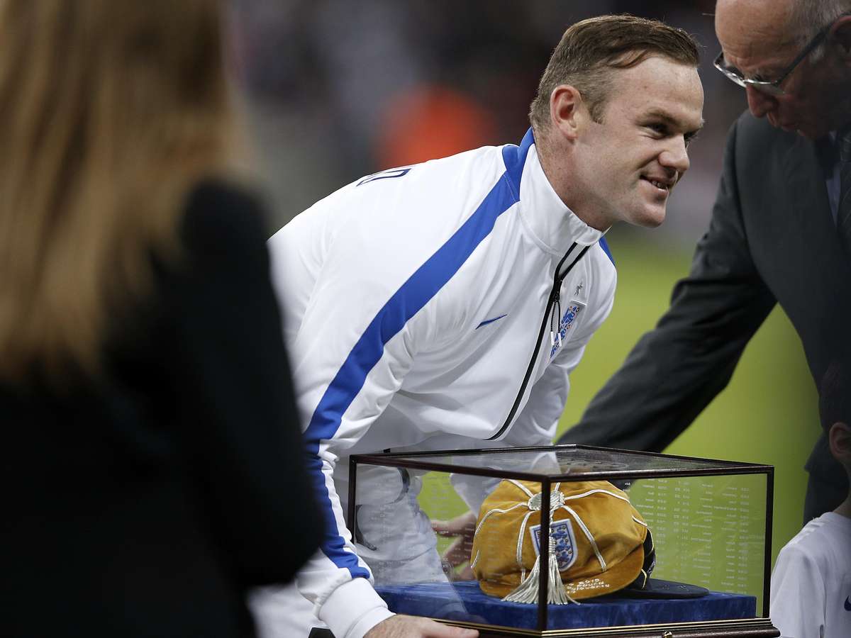 Já é tradição na Inglaterra: assim que um jogador completa 100 partidas pela seleção inglesa, ele é homenageado pela Associação de Futebol (FA) ganhando um bonito boné dourado em frente à torcida em pleno Estádio de Wembley. Ídolos como David Beckham, Frank Lamprad, Steven Gerrard e Ashley Cole já foram condecorados desta forma. Neste sábado, Wayne Rooney alcançou tal marca no jogo diante da Eslovênia, pelas Eliminatórias da Eurocopa de 2016 e, pelo menos para os internautas, a premiação nunca fez tanto sentido. Ele recebeu o boné das mãos do lendário Bobby Charlton.