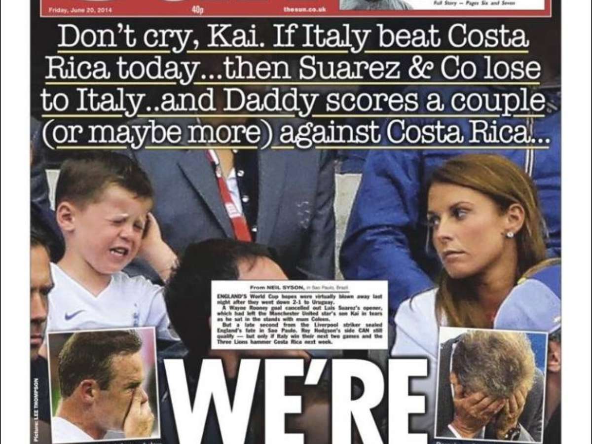O tabloide sensacionalista ironiza a situação da Inglaterra e tenta animar o filho de Wayne Rooney, à esquerda na foto. "Não chore, Kai: se a Itália bater a Costa Rica hoje, e Suárez e companhia perderem para a Itália, e se papai fizer dois (talvez mais) gols contra a Costa Rica... Nós estamos classificados!"