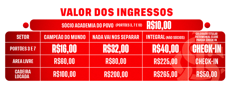Os ingressos que vão custar R$ 10,00 são para a categoria Sócio Academia do Povo. Com esses valores, a expectativa é que o Beira receba mais de 50 mil torcedores. Confira abaixo os preços dos ingressos para o duelo: