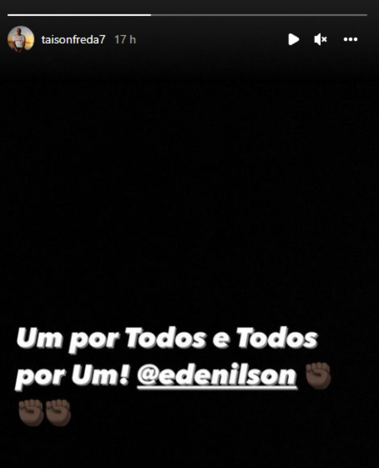 Taison, uma liderança no vestiário colorado, se pronunciou em seu Instagram com a mensagem "Um por todos e todos por um". O jogador marcou o Edenilson na publicação.
