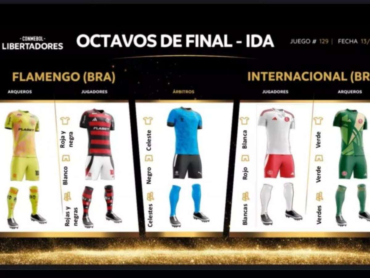 O Flamengo inicia a disputa das oitavas de final da Libertadores da América contra o Internacional na noite desta quarta-feira (13), no Maracanã, buscando o tetracampeonato da competição. Vale destacar que a Conmebol definiu os uniformes que cada equipe irá utilizar na partida de ida.