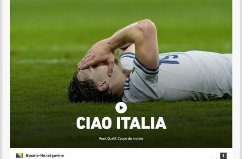 "Partida complicada desde a expulsão de Bastoni no final do primeiro tempo, apesar da equipe de Gattuso ter aberto o placar com Kean. Na cobrança de pênalti, Pio Esposito e Cristante completam o desastre épico. A vergonha, a humilhação. O fracasso, o flop. Mais uma derrota épica que marca a história da Itália. Azul-trevas. O drama da Itália em relação à Copa do Mundo parece não ter fim: desta vez, a Bósnia foi a sua algoz. Nesta terça-feira, 31/3, na rodada decisiva da repescagem da Europa, a Azzurra foi até o Estádio Bilino Polje, em Zenica, sonhando em acabar com a maldição das eliminações que marcaram a equipe nas duas últimas Copas, em 2018 e 2022".
