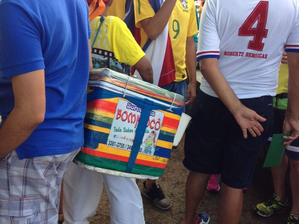 Ao contrário do que é exigido pela Fifa, vendedores não licenciados comercializam produtos como sorvetes, bebidas e salgadinhos de milho, entre outros. Os preços abaixo do padrão Fifa atraem os torcedores. Uma batata da marca Elma Chips, por exemplo, sai a R$ 2. Dentro do estádio, o preço de produto similar é quase quatro vezes maior: R$ 7.