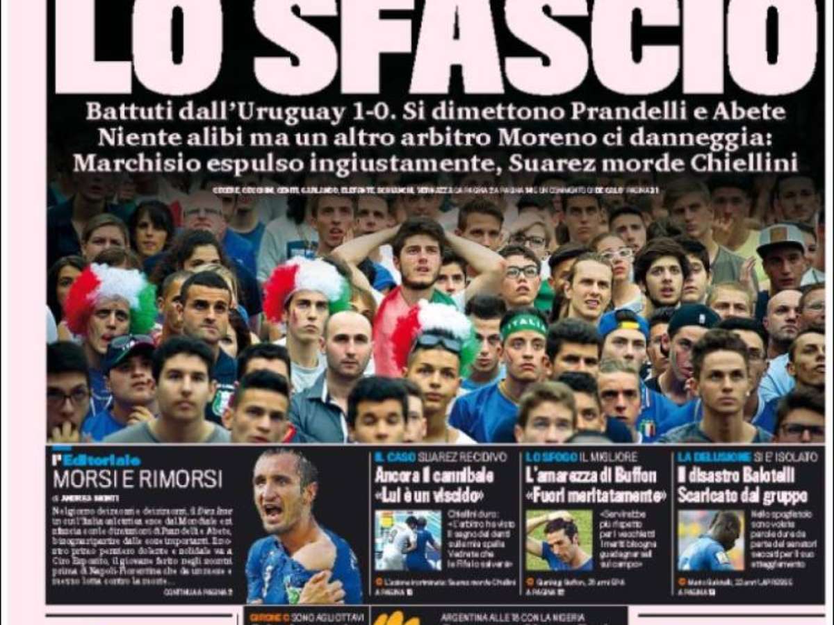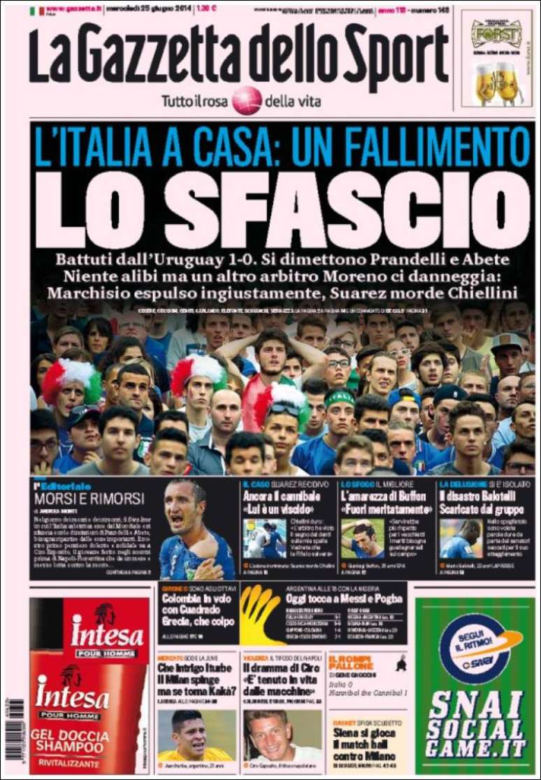 "Fracasso azul: demissão de Abate e Prandelli", diz o jornal, referindo-se ao anúncio das saídas de Cesare Prandelli (técnico da Itália) e Giancarlo Abete (presidente da Federação Italiana de Futebol, a FIGC)