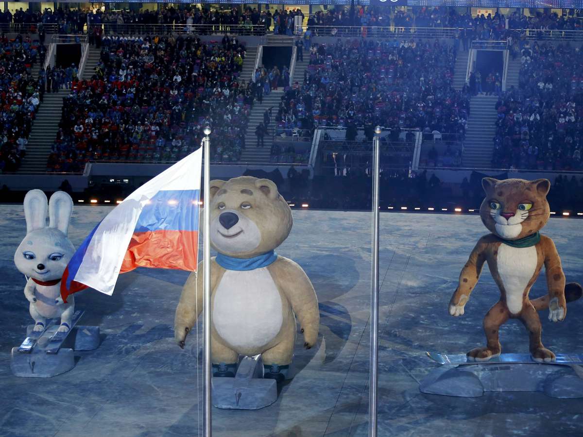 Uma novidade na Cerimônia de Abertura foi o fato de os atletas, após o desfile, não permanecerem de pé no gramado – ritual demorado e potencialmente cansativo. Após serem apresentados ao público, se encaminhavam para as arquibancadas do Estádio Olímpico Fisht. O evento continuou com os mascotes – o Urso, a Legre e o Leopardo – esquiando, patinando e andando de snowboard.